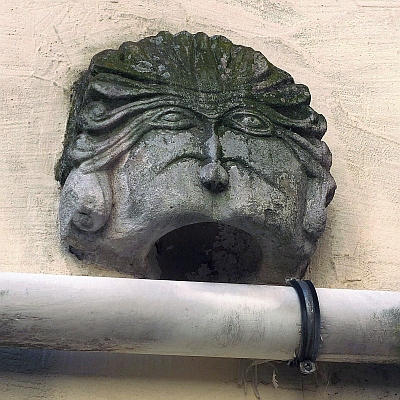 - Einmal am Hause Massard in der Jakobstraße. In die lange Front der Fenster ist auch der Kellereingang einbegriffen, und da die Keilsteine in den Fenstern eine barocke Zier haben, hat der Schlußstein des Kellereingangs dieses kunstvoll gehauene Schrotmaul.