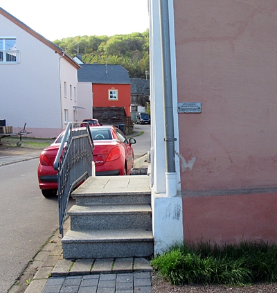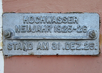 Hochwassermarke an Hauswand Spielesstraße 24.