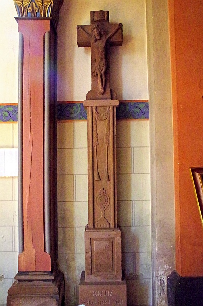 Unter der Empore stehen die volkstümlich derbe Figur des heiligen Nepomuk aus dem Jahre 1823 und das schlanke Schaftkreuz, beide aus rotem Sandstein und von derNimsbrücke hierher versetzt. Das Kreuz wurde laut Inschrift 1821 von GERHARD SCHRAM aus Heilenbach errichtet, sein Schaft nit dem Relef einer Monstranz trägt ein verhältnismäßig hohes Kruzifix. [2]