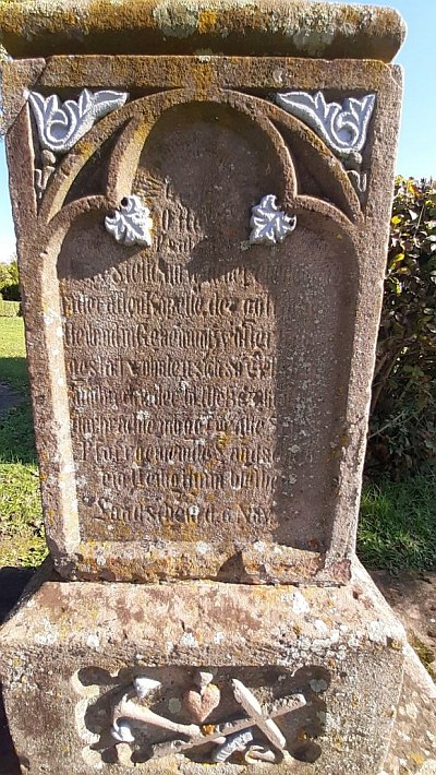 Inschrift: Durch Witterungseinflüsse bedingt kann man nur die letzten 4 Zeilen lesen. Diese haben folgenden Wortlaut: