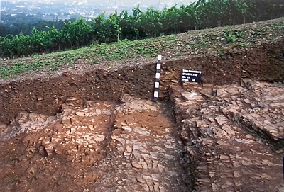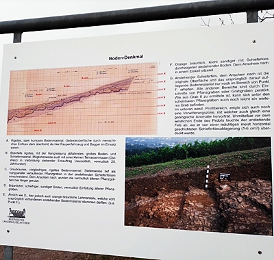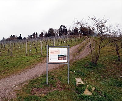 An dieser Stelle in den Weinbergen auf dem Petrisberg wurde vor Jahren vom Rheinischen Landesmuseum Trier ein Bodenprofil erstellt, in dem die unterschiedlichen Bodenschichten von der obersten rigolten Humusschicht bis zum anstehenden Schieferfels freigelegt wurden. [1]