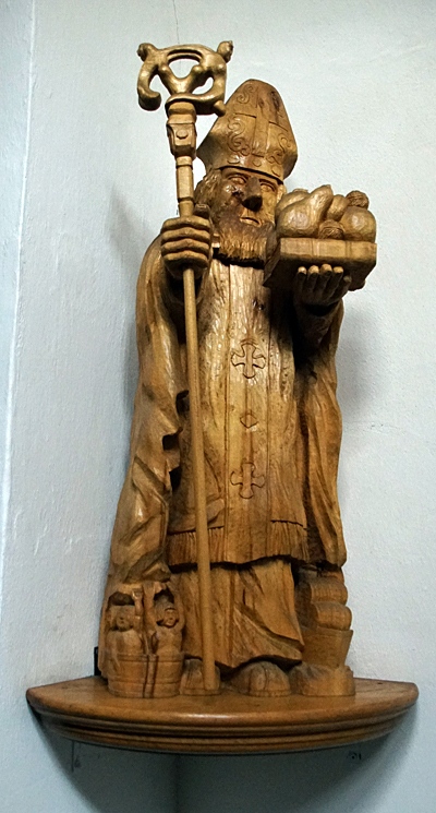 Bild 1: Holzfigur des Hl. Nikolaus, vom einheimischen Künstler Karl-Josef Schenk geschnitzt. Die Skulptur ist aus einem Baumstamm erstellt, nur der Bischofsstab ist gesonders geschnitzt. [1]