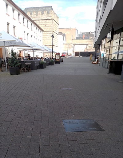 Gusseiserne Plakette im Straßenbelag in Blickrichtung des Frankenturms.