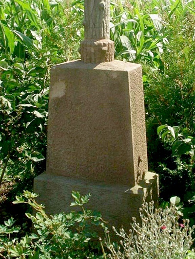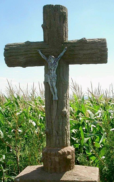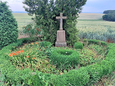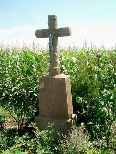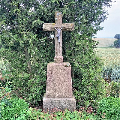 Ein schwerer Sockelstein , darauf ein schwerer Schaft. Über dem Schaft ein Baumstammkreuz mit einem eisernen Korpus, gute Steinmetzarbeit. Das Kreuz steht etwas versteckt im Feld, aber in einer kleinen sauberen Anlage. [1]