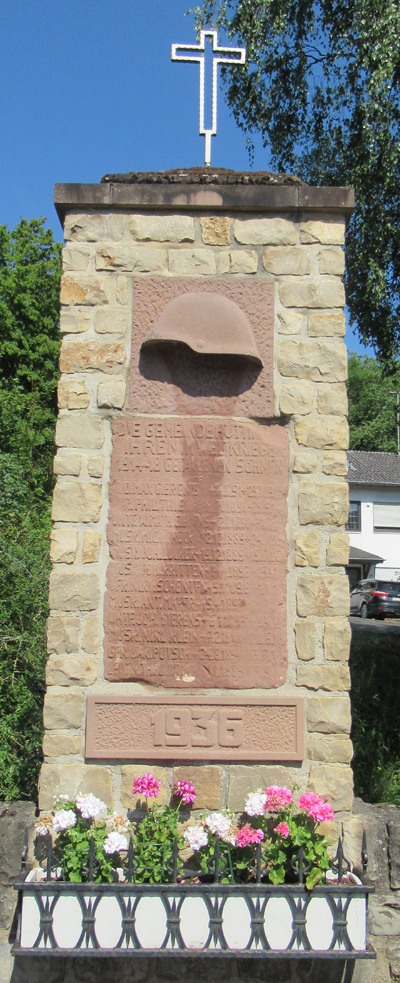 Vor der Kirche Sankt Antonius befindet sich dieses Ehrenmal von 1936 für die Gefallenen des ersten Weltkrieges der Gemeinde Hüttingen an der Kyll, in neuerer Umfassung gemauert. [1]