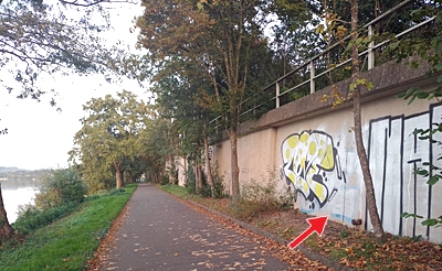 An der Unterführung der B 51 von Konz-Karthaus, Trierer Straße zum Moselradweg hin sind an einem Brückenpfeiler 2 Hochwasserereignisse markiert: