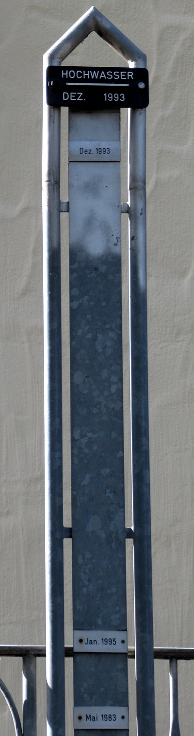Am Anwesen Moselstraße 7 (Haus Hedwig) ist eine Metallleiste mit mehreren Hochwassermarken angebracht.