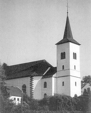 Nach Plänen des Trierer Stadtbaumeisters Johann Georg Wolff 1849 erbaut. Von der abgebrochenen dreischiffigen Säulenbasilika wurde der Chor in den Neubau integriert. Reste der Ausstattung des 18. Jahrhundert, Kulturdenkmal. [1]
