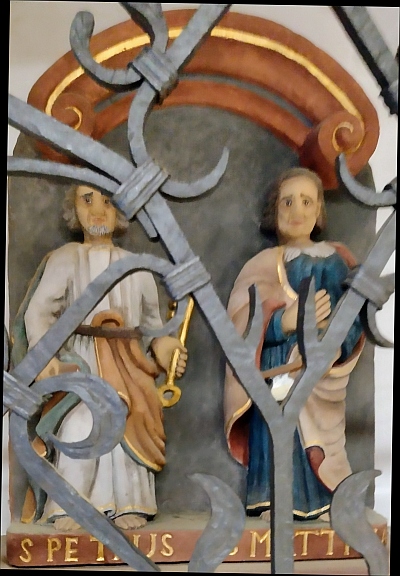 Heutiger Standort der beiden Heiligenfiguren ist der Eingangsbereich der Unkensteinhalle, direkt über deren Grundstein von 1982. Ursprünglich befanden sich die Reliefs in der Eifelstraße 16 über der Haustür des abgerissenen Hauses von Peter Zirbes, dessen Neffe gleichen Namens an gleicher Stelle einen Neubau errichtete. Gerhard Wax, der damalige Pastor von Bergweiler, dem die Seelsorge Pleins oblag, „sicherte“ die He iligen für sein dortiges Raritäten Museum. Zur Einweihung der neuen Halle "schenkte" er jedoch den Pleinern die Figuren, deren Alter und das des Ursprungshauses unbekannt sind. [1]