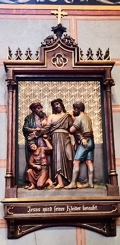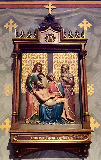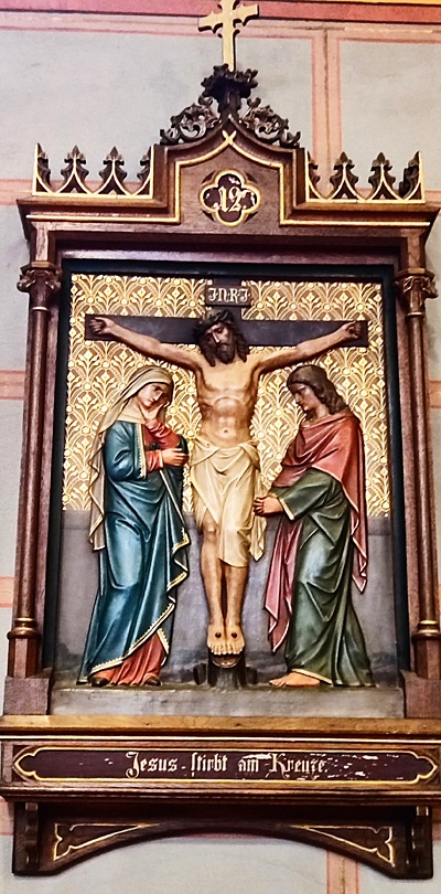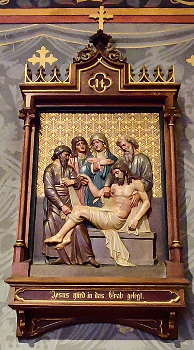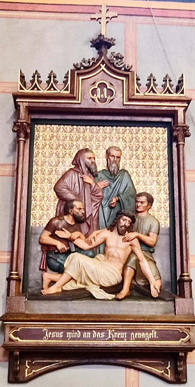 Holzvertäfelte, aufwendig verarbeitete 14 Kreuzwegstationen im Innenraum der katholischen Pfarrkirche Sankt Martin in Schweich. [1]