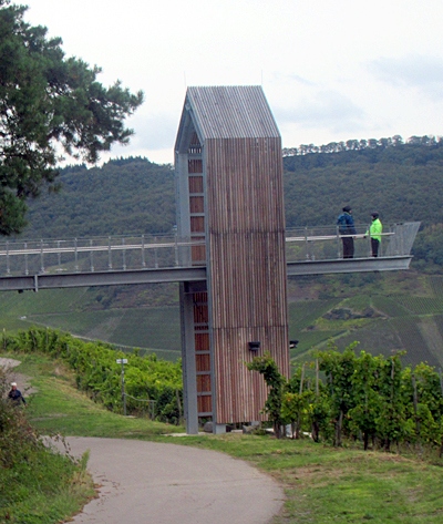 Die Aussichtsplattform bietet einen Weitblick auf das malerische Landschaftsbild der Mosel mit Aussicht auf die Burg Landshut, die Weinberge bis hin zum historischen Stadtkern. Die luftige Turmkonstruktion schafft eine Verknüpfung zur Jahrhunderte alten Kulturlandschaft der Weinberge, macht sie intensiv erlebbar und wahrnehmbar. [1]