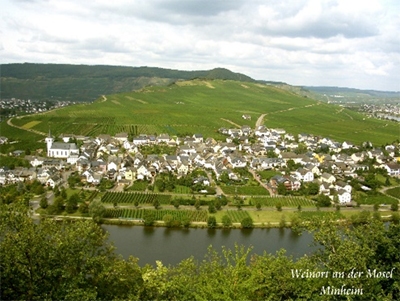 Tief unten zieht die Mosel in einem Halbkreis um den Ort Minheim, links sind Niederemmel, (Piesport), Reinsport und Müstert zu sehen, im Hintergrund strebt der Kirchturm von Piesport zum Himmel. Rechts winken Wintrich, das anmutige Kesten und das höher gelegene Monzel. In Ferne ragt der zierliche Zwiebelturm der Pfarrkirche Filzen empor. Das ganze Bild wird eindrucksvoll umrahmt von den grünen Reben, den Wahrzeichen der Mosel und dem hohen Berg.