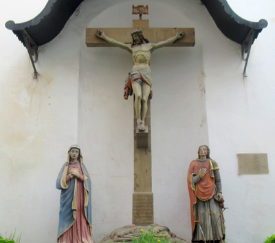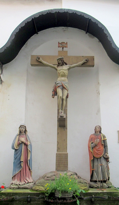 Kalvarienberggruppe von 1585, 1975 renoviert, außen an der Nordwand des Kirchenschiffs angebracht, ursprünglicher Standort war der Friedhof. [1]