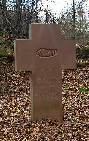 Inschrift: Zum Andenken an das Brautpaar Peter Burens aus Saarburg und Maria Scheuer aus Körrig 200 Jahre nach dem Brautkreuz errichtet.