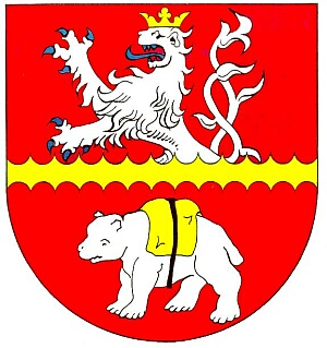In Rot ein goldener Dornenbalken. Oben ein wachsender golden gekrönter, blau bewehrter, doppelt geschwänzter silberner Löwe. Unten ein silberner, mit goldenem Reisegepäck beladener Bär; das Reisegepäck wird durch einen schwarzen Gurt gehalten.