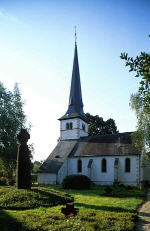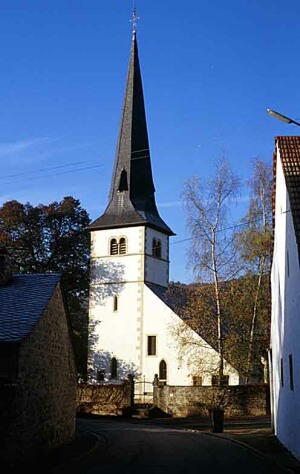 Die ehemalige Pfarrkirche liegt im alten Ortskern auf dem von einer Bruchsteinmauer umfriedeten früheren Kirchhof. Keine der frühen urkundlichen Nennungen - die erste erfolgte um 800 in einer Schenkungsurkunde an die Abtei Echternach - bezieht sich direkt auf einen Kirchbau. Der erhaltene Bau gehört im wesentlicher drei verschiedenen Perioden an: die unteren Geschosse des Turms der Romanik, das Turmobergeschoß und das Kirchenschiff der Spätgotik. Das 18. Jahrhundert fügte schließlich die kleine Vorhalle und die Sakristei an.