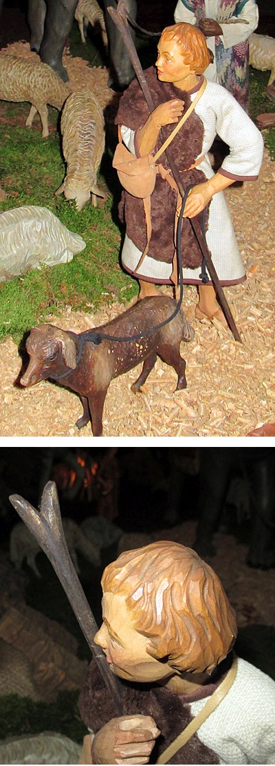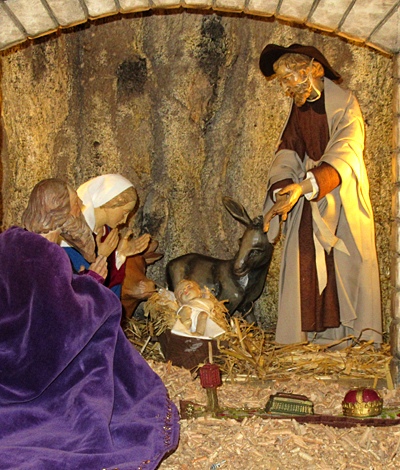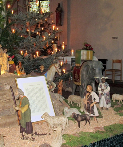 Aufwendige und liebevoll gestaltete Weihnachtskrippenlandschaft mit zahlreichen holzgeschnitzten und mit Textilien versehenen Krippenfiguren. [1]