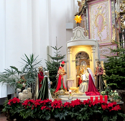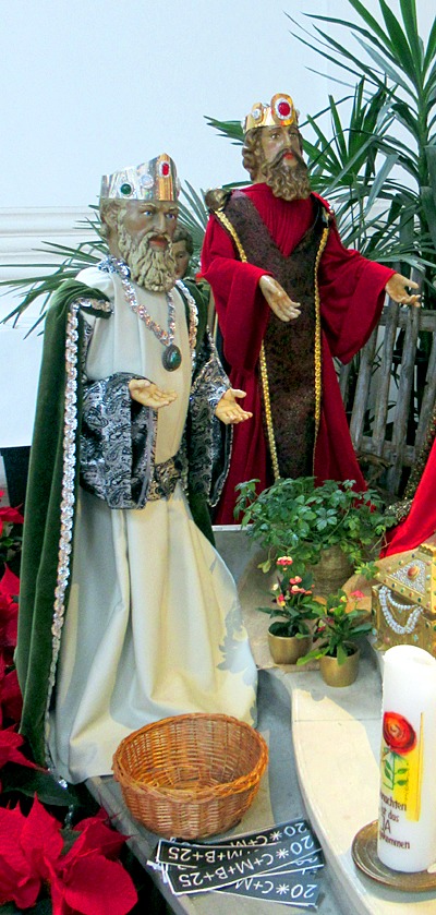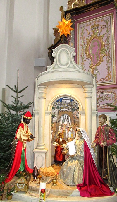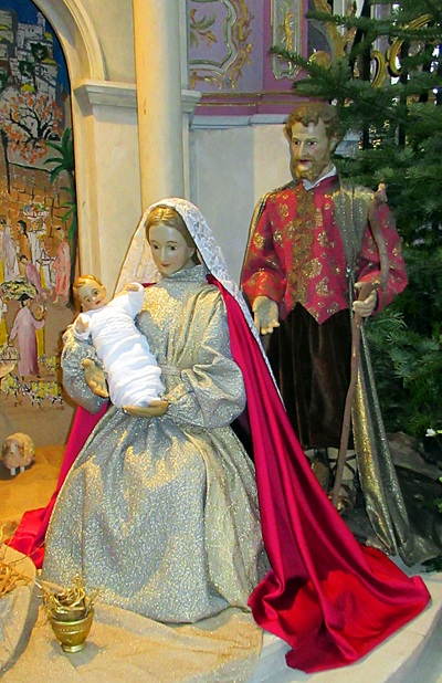 Weihnachtskrippe 2024/25 in Sankt Paulin. Ca. 50-60cm hohe Krippenfiguren, mit hochwertig verarbeiteten Textilien versehen. [1]