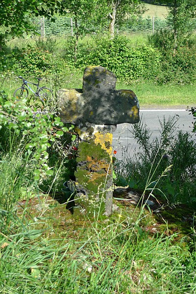 Kreuz an der Landesstraße 27. Auf Höhenpunkt 611,9 Meter über Normal-Null. Südlich der Ortslage an der Straße nach Neroth. Sogenanntes Schwarzes Kreuz, Balkenkreuz, Basaltlava, bezeichnet 1728. [1]