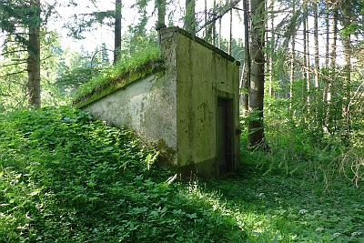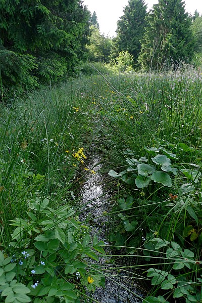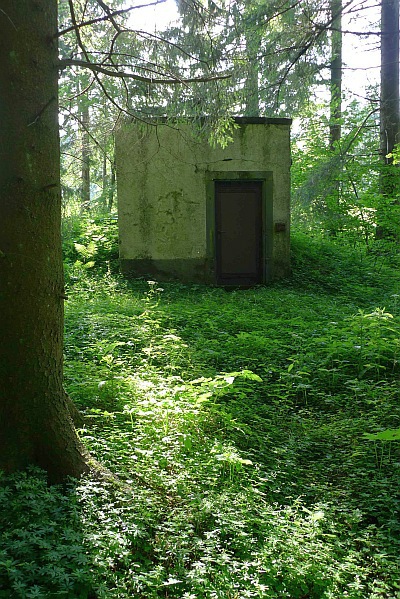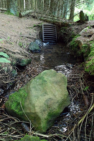 [...] Man muß zuerst über eine Wiese [2554487 5564142] gehen, auf der ein Schuppen und ein Hochsitz stehen. Dann geht man bis zum Waldrand und stößt dann auf die Kleine Kyll. Man folgt ihr bachaufwärts bis zum Gitter. Da sie von der Quelle im Wasserhäuschen unterirdisch fließt, muß man noch ca. 30 m in in östlicher Richtung bis zum Wasserhäuschen gehen [1]