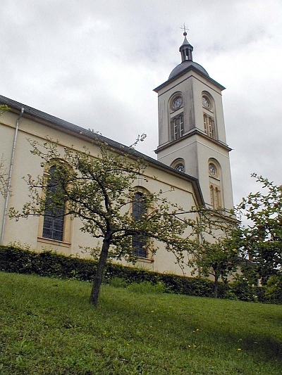 Die Kirche Sankt Michael wurde in den Jahren 1838/39 erbaut. Es ist ein saalartiger Bau mit großen Bogenfenstern, der Turm ist an der Ostseite angebaut. Im Inneren sieht man die nach innen eingezogenen Strebepfeiler, auf die runde Halbsäulen gesetzt sind. Die Holzdecke wurde 1966-68 eingezogen. Im Altarraum steht ein klassizistischer Säulenaltar; die Fenster auf der linken Seite stammen noch aus der Erbauungszeit, ebenso der Taufstein und die Bänke. [2.]