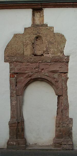 Die rundbogige Toreinfahrt zum ehem. Jesuitennoviziat, das heutige Schwesterntor, wurde etwa in der Flucht der Hauptschiff-Scheidarkatur errichtet. Auffallend ist das manieristisch gestaltete Gewände mit alternierend kurzen und langen, über einem Pilastersockel aufgeführten Eckquadern, die wie der hängende Scheitelstein einen erhabenen Spiegel ausbilden. Der giebelförmige Abschluß der Einfahrt mit der Figurennische entstand, wie wohl auch die dahinterliegende offene Halle, erst 1867 nach einem Entwurf des Maurermeisters Joseph Weis.