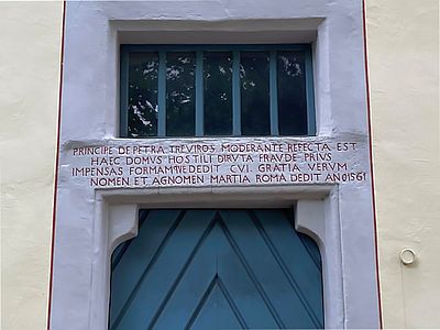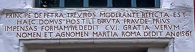 Als (Kur-) Fürst (Johann von der Leyen) die Trierer regierte, ist hergestellt worden dieses Haus, das durch feindlichen Trug vorher zerstört war. Die Kosten und den Bauplan gab, dem die Gnade (der Taufe) den wahren Namen (Johannes) und den Zunamen (Romer, lateinisch: Romanus) die kriegerische Roma gegeben hat. Im Jahre 1561. [1]