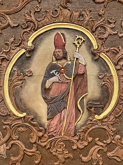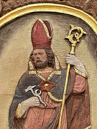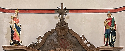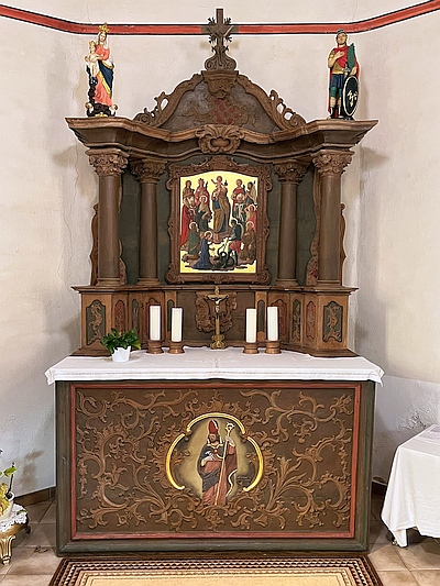 Das wertvolle Antipendium [= verzierte Verkleidung des Altars. Red.] aus dem 17. Jahrhundert zeigt den Bischof Sankt Eligius mit dem Hammer (Patron der Gold- und Hufschmiede). Krönender Abschluss des Altars bilden die schönen Holzfiguren, Maria mit dem Kinde und Sankt Donatus, der Blitze und Donner abhalten soll. [2]