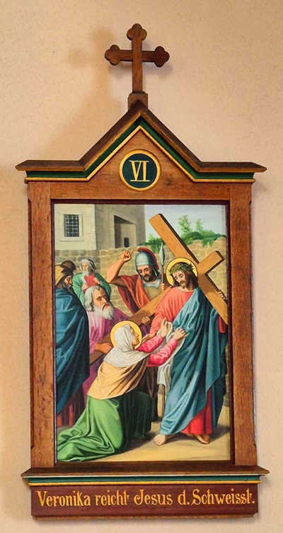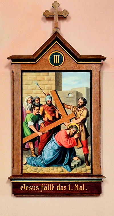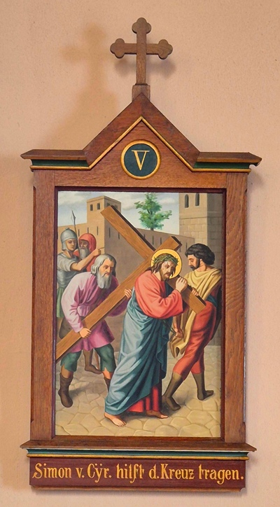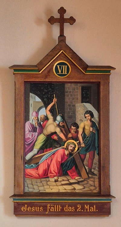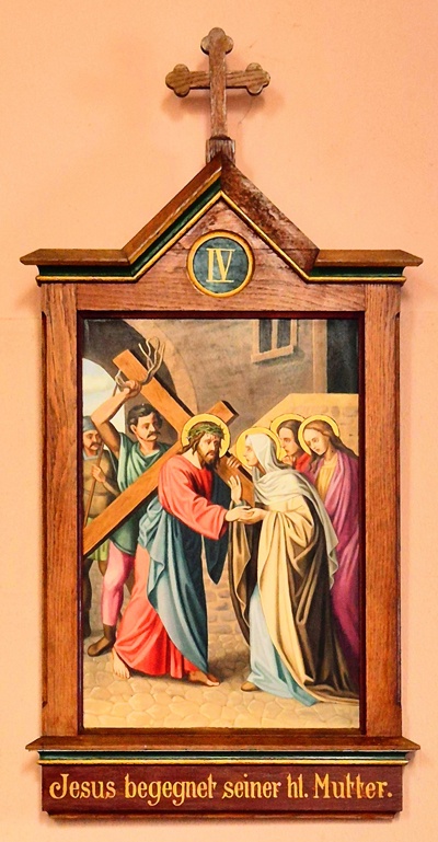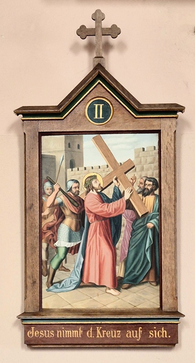 Holzvertäfelte Kreuzwegstationen 2-6 im Innenraum der Kirche Sankt Walburga und Sankt Quirin. Gemalter Kreuzweg von J. Scharding, Trier, 1912. [1]