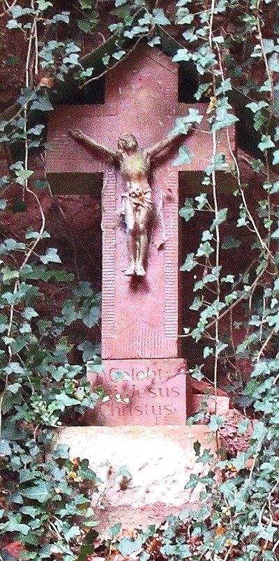 Sandsteinkreuz mit Korpus im Dickicht am Wegesrand.