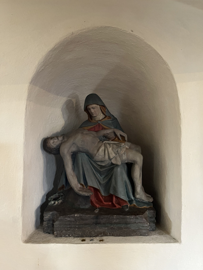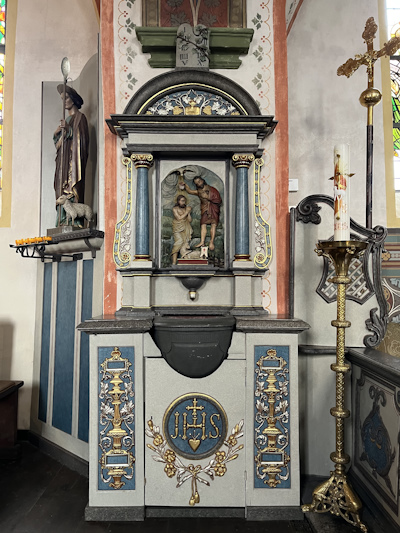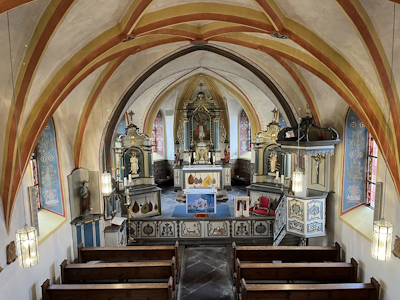 Im Kern spätgotischer Saalbau um 1500. Altäre um 1775. Vollständig erhaltene barocke Innenausstattung. [2]