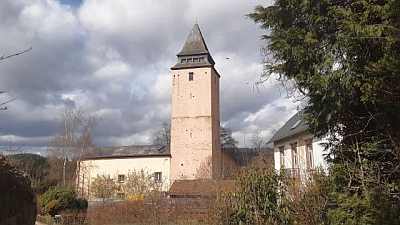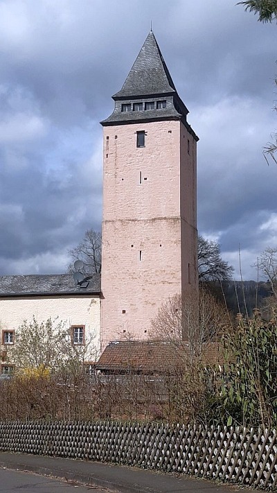 Ab 1239 durch den Trierer Erzbischof Dietrich II. angelegt und wenig später in die Befestigung des Ortes einbezogen. Aus dieser Zeit im wesentlichen die etwa dreieckige Grundform und der hohe Bergfried auf der Südseite erhalten. Der an den östlichen Ringmauerabschnitt angelehnte Palas im ausgehenden 16. Jahrhundert, die Wirtschaftsgebäude am Nordrand des Hofes 1764 neugebaut. Um 1840 Umbau der früheren Stallungen zwischen Bergfried und Straße zu einem zweiklassigen Schulhaus. 1911 Abbruch des Palas für einen größeren Schulneubau nach jahrelangen Planungen und Beratung durch den rheinischen Provinzialkonservator. Das baufällige Wirtschaftsgebäude aus dem 18. Jahrhundert erst nach dem Zweiten Weltkrieg ersatzlos beseitigt. [1]