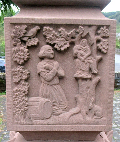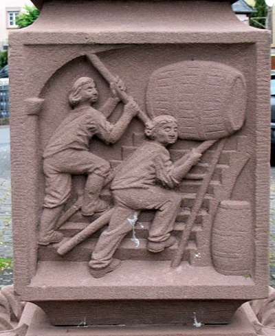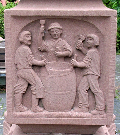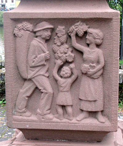 Die vier kleinen Reliefs sind Darstellungen aus der Jahresarbeit des Winzers. Die Sandsteinsäule bekrönt eine Figur, welche den Pfarrer Johannes Hau darstellt. Er wirkte von 1765 bis 1803 in der Pfarrei Sankt Michael. In jeder Hinsicht lag ihm das Wohl seiner Pfarrkinder am Herzen. Es ist sein Verdienst, die besondere Bedeutung der Rieslingrebe für den heimischen Weinbau erkannt zu haben. Er verhalf ihr bei den Winzern zum Durchbruch.