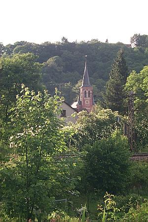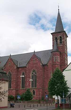 Stattliche neugotische Hallenkirche, bichromer Sandsteinquaderbau mit treppenturmflankiertem Eingangsturm, 1873–75, Architekt Carl Arendt, Luxemburg; Chorfenster und ein Schiffsfenster, 1960 und 1991 von Jakob Schwarzkopf. [2]