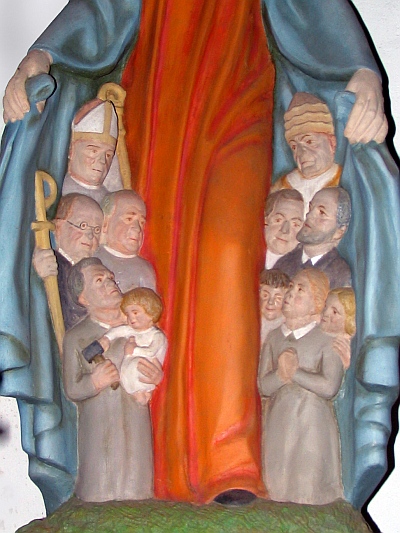 1938: Schaffung der Schutzmantelmadonna “Maria, Hilfe der Christen” durch den Bildhauer Anton Nagel. Er stellt sich selbst, seine Frau und die drei Kinder zuunterst unter den Mantel Mariens. weitere Personen unter dem Mantel: