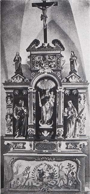 Hervording, gen. Keffingen, von Kreutz. Letztere drei Stifter sind ebenfalls dem Springiersbacher Konvent zuzuordnen. Zu dem Altar finden wir in lateinischer Schrift folgende Inschrift: Zu Ehre der dreimal besten und guten Mutter Maria, derBartolomäus und Barbara hat der vornehme und edle Herr Johann Friedrich Auwach aus Wittlich, Abt in Springiersbach mit drei weiteren Stiftern diesen Altar errichten lassen.