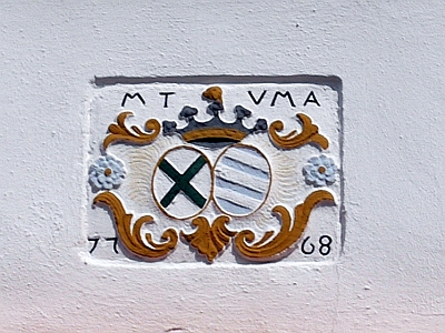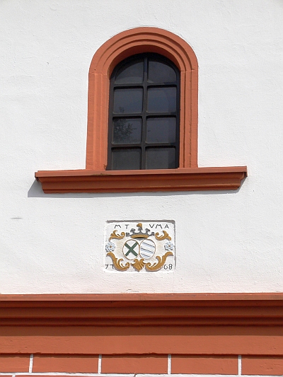Das Wappen der Maria Theresia von Meuthen befindet über dem Eingangsportal. Die Äbtissin von Sankt Thomas ließ im Jahre 1768 die heutige Pfarrkirche von Meisburg erbauen.