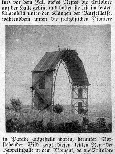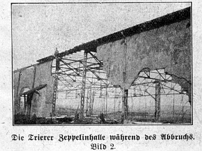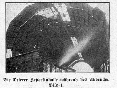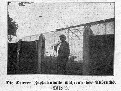 Am Samstag, den 21. Juni1930, abends gegen 20 Uhr, stürzte der letzte Rest der ehemals stolzen Trierer Zeppelinhalle unter den Schweißapparaten bzw. der Zerstörungsarbeit französischer Pioniere zusammen. Die Franzosen hielten bis kurz vor dem Fall dieses Restes die Trikolore auf der Halle gehisst und holten sie erst im letzten Augenblick unter den Klängen der Marseillaise währendem unten die Pioniere in Parade aufgestellt waren, herunter. Die Photographie konnte nur unter Anwendung größter Vorsicht aufgenommen werden. Zwei anderen Photographen , die das Gleiche versuchten, wurden die Platten abgenommen. und durch Fusstritte französischer Soldaten bzw. Gendarmen misshandelt und dann vom Gelände gejagt. [2]