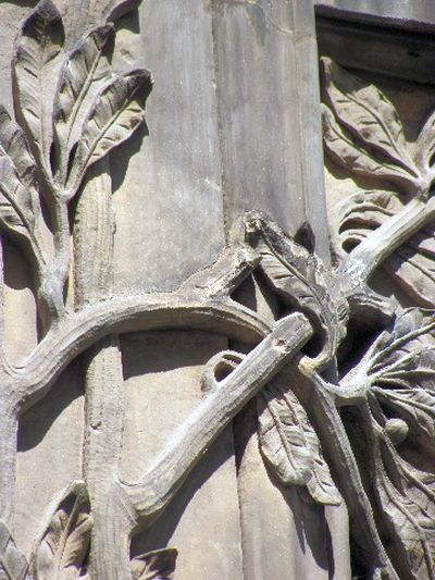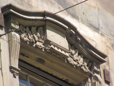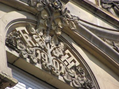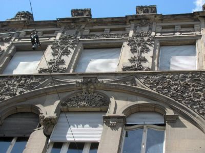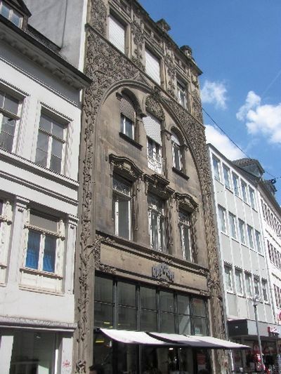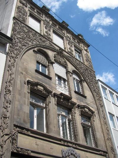 Das viergeschossige, die Nachbarbebauung deutlich überragende Traufenhaus mit einer in der Trierer Altstadt einzigartigen, sandsteinverkleideten Jugendstilfassade. Außergewöhnlich ist der Verzicht auf jeglichen Stuckdekor: Sämtliche subtilen Schmuckformen sind aus Sandstein gearbeitet Das Ladenparterre und die beiden unteren Obergeschosse der Dreiachsenfassade faßt ein halbrunder Blendbogen zusammen. An den Seitenteilen wächst naturalistisches Ast- und Rankenwerk empor, das sich in den Bogenzwickeln zu einem dicht verschlungenen, die Fläche völlig ausfüllenden Blätterwerk steigert Die Fenster im ersten und zweiten Obergeschoß zu Gruppen zusammengefaßt. Im zweiten Obergeschoß, dessen Balkon abgebrochen wurde, zeigt die Lünette der mittleren Fenstertür ein Relief mit dem Baudatum und den Initialen des Bauherrn. Von der vertikalisierenden Gliederung der drei unteren Geschosse abgesetzt ist der oberste Stock: Über seinen Rechteckfenstern gliedern eigentümliche, eingetiefte und konsolenbesetzte Rechteckfelder zwischen floralverzierten Lisenen den Drempelbereich. Eigenwillig sind auch die über der Traufe angebrachten, kaminkopfähnlichen und aus Jugendstil-Dekor entwickelten Aufsätze. Bis auf die veränderte Ladenzone sind alle im Oberlicht mit einer Eisenversprossung ausgestatteten Holzfenster erhalten.