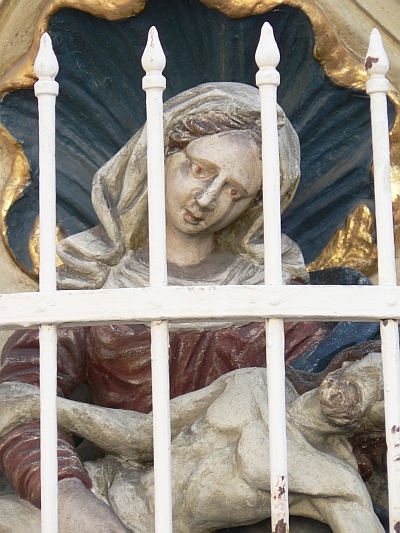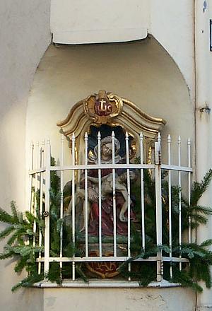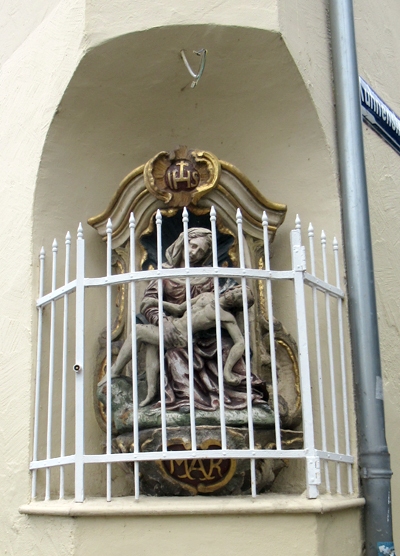 An der abgekanteten Hausecke eine barocke, vermutlich aus der Mitte des 18. Jahrhundert stammende Pietà eingebaut (Sandstein, farbig gefaßt). Der Sockel weist eine mit MÄR bezeichnete Kartusche auf; die flach gebogene, nischenartige Kleinarchitektur hinter der Figurengruppe zieren ein Muschelrelief im Bogenfeld, jeweils zwei gegenläufige C-Schwünge an den Flanken und eine mit dem Jesuitenemblem bezeichnete Kartusche im gebogenen Giebel. Die Barockskulptur diente ursprünglich möglicherweise als Portalaufsatz. [1]
