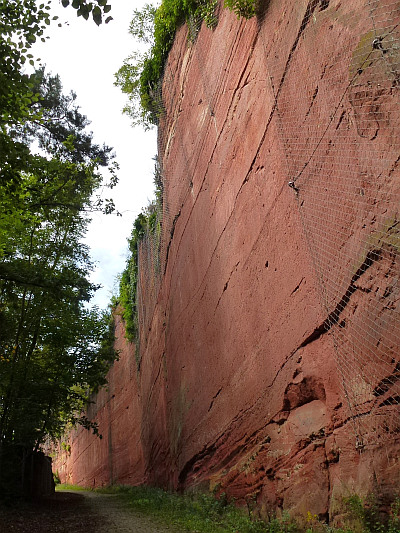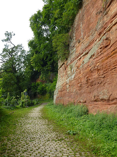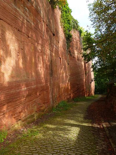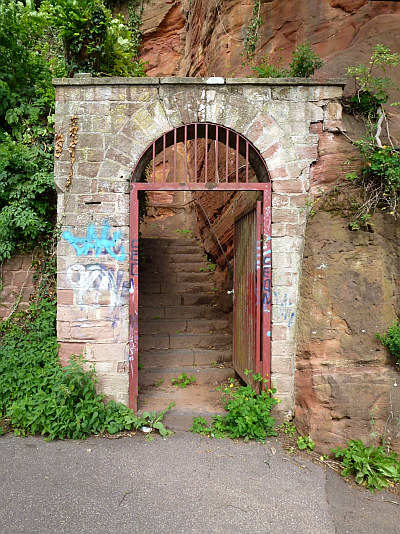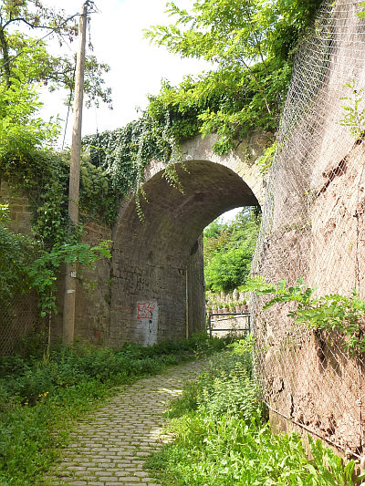 [...] zur Verkürzung des Weges von der westlichen Ausfallstraße und als Zugang zu der im Bau befindlichen Kaiser-Wilhelm-Brücke von der Bitburger Straße aus eigens angelegt, dafür ein Teil des roten Felsens senkrecht abgearbeitet, an der Felswand bez. ERBAUT 1909. [1]