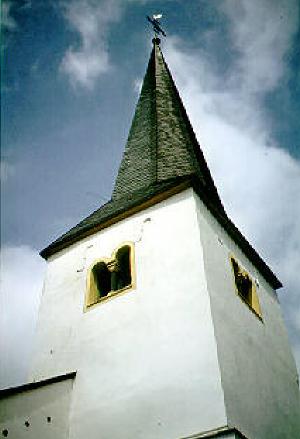 Romanischer Turm in Krettnach. Seltener Typ eines romanischen Kirchturm und ältestes erhaltenes Bauteil der 1148 erstmalig genannten Kirche. Schöne Schallfenster mit feingliedrig gearbeiteten romanischen Säulchen am Glockenraum des Turms. Romanische Türme finden sich im Saar-Obermoselgebiet noch an vielen Orten entweder neben wesentlich neueren Kirchen (z. Pellingen) oder freistehend nach Verlust der Kirche (z.B. Tawern)