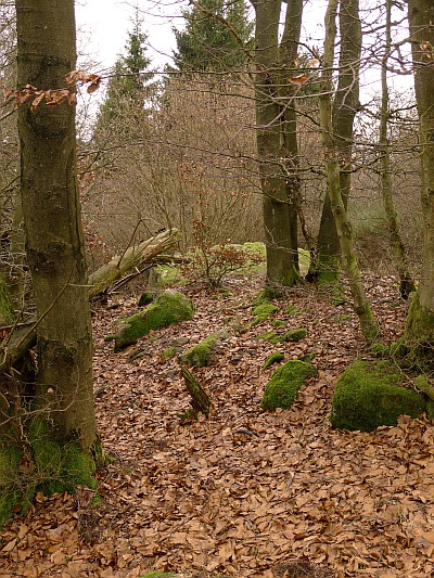 ... Derselbe Roilmann weiset auch anstelle Adams, des Zenders zu Kelberg: Von dem Grendel über Reme und über den Berg bis zum Stein, der Teufelsbett (Teufelsbett) genannt wird; von dem Stein die Straße hinab bis in die Nuyrberger (Nürburger) Straße; diese Straße nach bis hinter Teelgins beumgin (Bäumchen); ferner die Anhelde (Held) hinauf auf den Hoenkelberg (Hochkelberg); abwärts nach rechts zum Rameisberg (Rameisberg); abwärts Nyd-den über Adensyffen (Adenseifen); von da an weiter auf den Rynbergk (Reimerich) zu; auf den Stock daselbst; weiter dem Moißbroichs (Moosbruch) Syffen abwärts; von da an zwischen dem Koirbusche (Kortenbusch) weiter bis auf die Merenerstraße (= Ferkelstraße); die Straße hindurch bis zum Ende des Aireholtze (Maarholz). [1]