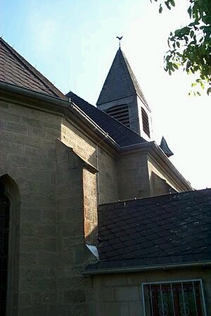 Stiltragende Elemente sind getreppte Strebepfeiler und spitzbogige Fenster mit einbeschriebenen Dreipässen. Der Giebelfassade eingefügt ist eine Spitzbogenblende mit rechteckigem Portal: der kriegsbeschädigte Dachreiter 1960 durch einen kantigen Aufbau unter Schieferhelm ersetzt. Eine Sakristei 1955 angebaut.