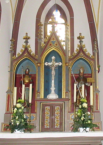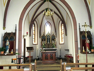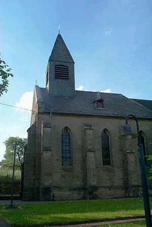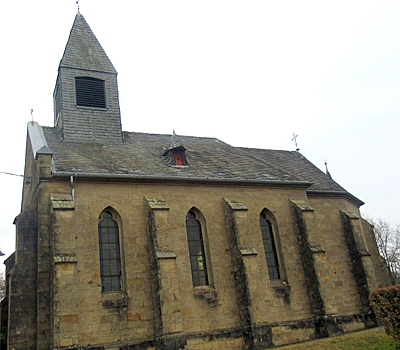 Am hochgelegenen nordöstlichen Hangabschnitt und vom Friedhof umgebener, neugotischer Quaderbau aus örtlichem Sandstein. 1885 nach Plänen von Dornbaumeister Reinhold Wirtz anstelle der Vorgängerkirche erbauter kleiner Saalbau zu drei Achsen und eingezogenem. fünfseitigem Chor.