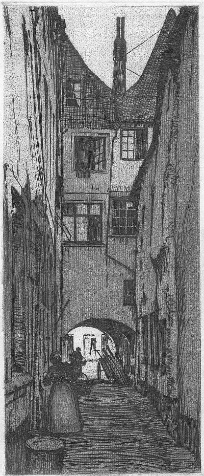 Bild 5: Radierung von Fritz Quant: Judengasse in Trier, Maße: 300 mm x 135 mm, 1917 oder früher. Fritz Quant, CC BY-SA 4.0