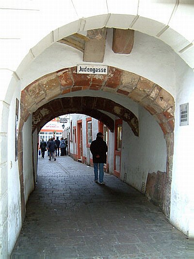 Heute noch durch eine in zwei Häusern eingebaute Pforte am nördlichen Übergang vom Hauptmarkt in die Simeonstraße (Hauptmarkt 23/Simeonstraße 37) zu betretende Gasse des spätestens im 11. Jahrhundert. bestehenden, erstmals 1235 urkundlich erwähnten Judenviertels (inter Judeos) nordwestlich des Hauptmarkts.