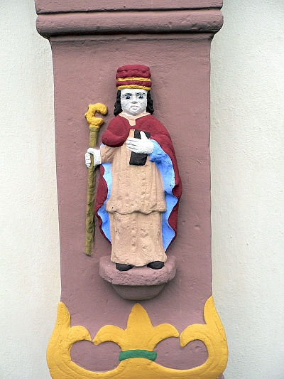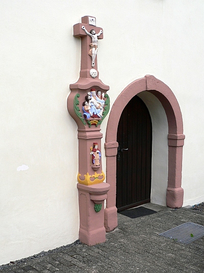 Sankt Cornelius; kleiner Saalbau, bezeichnet 1777; Bildstock, Rotsandstein, wohl aus der zweiten Hälfte des 18. Jahrhunderts. [2]