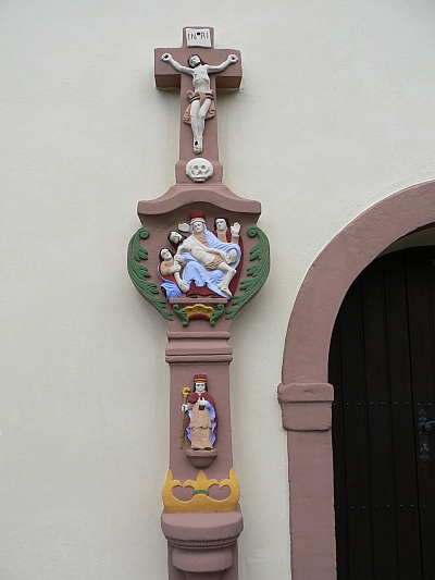 Außen an der Westwand ein Wegekreuz, etwa 3m hoch vom Ende des 18. Jahrhunderts mit Kruzifix, Pietà und er Figur des heiligen Papstes Cornelius. [3]
