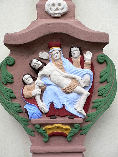 Das Pestkreuz von 1814 an der Kirche in Pantenburg zeigt Petrus auf dem Himmelsthron. Gewand und Schlüssel sind goldglänzend. Sein Blick ist wachsam, doch distanziert. Machtvoll steht er über der Welt. Mit der linken Hand hält er das Buch des Lebens.